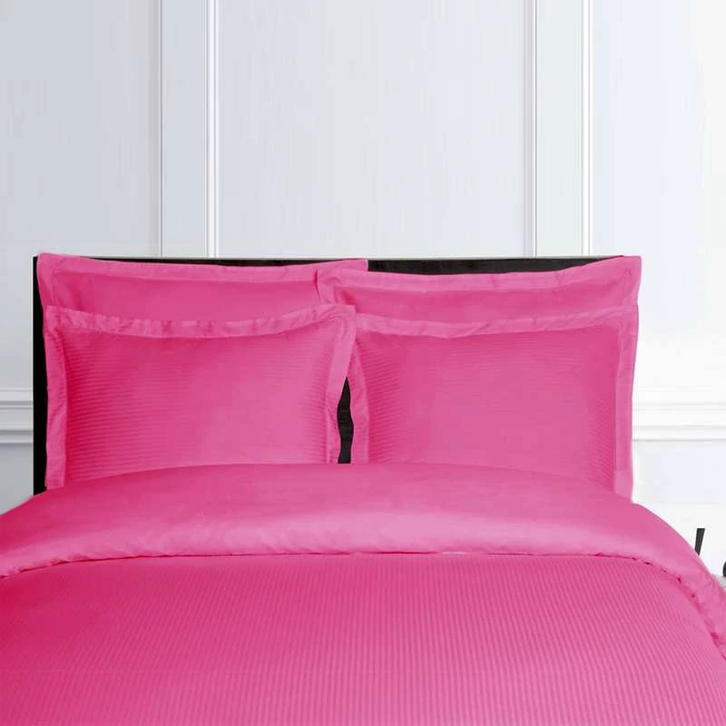Parure housse de Couette fines rayures fuchsia, vendue avec 2 taies d’oreiller 65 x 65 cm.